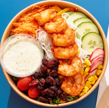 Crevettes épicées (6), vermicelles, carotte, poivron, concombre, radis, tomate, maïs, canneberges, laitue et vinaigrette yogourt, lime et coriandre